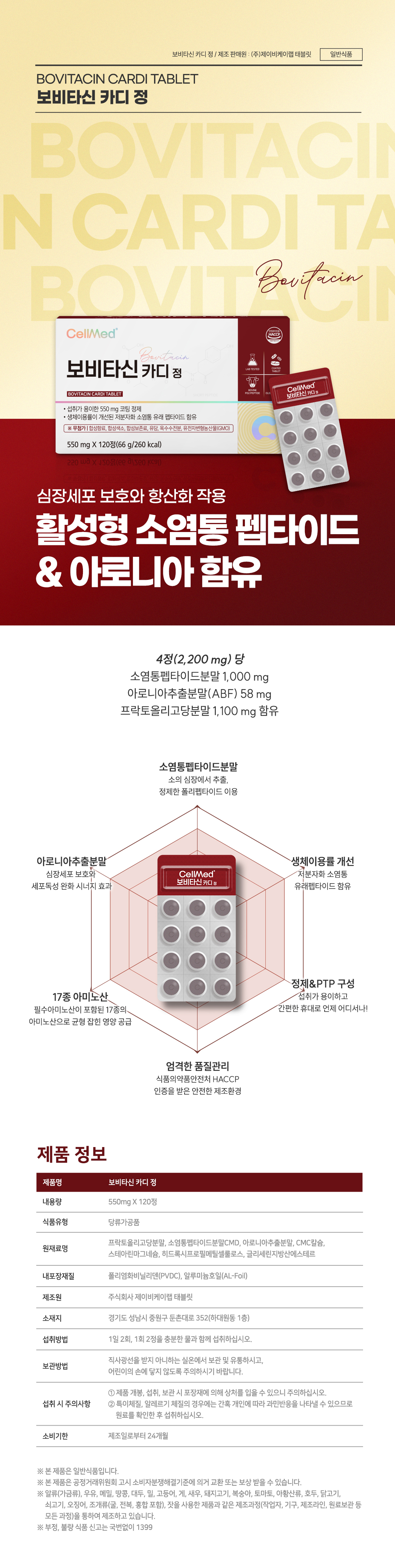 4정(800 mg)당 소염통펩타이드분말 1,000 mg, 아로니아추출분말(ABF) 58mg, 프락토올리고당분말 1,100 mg 함유