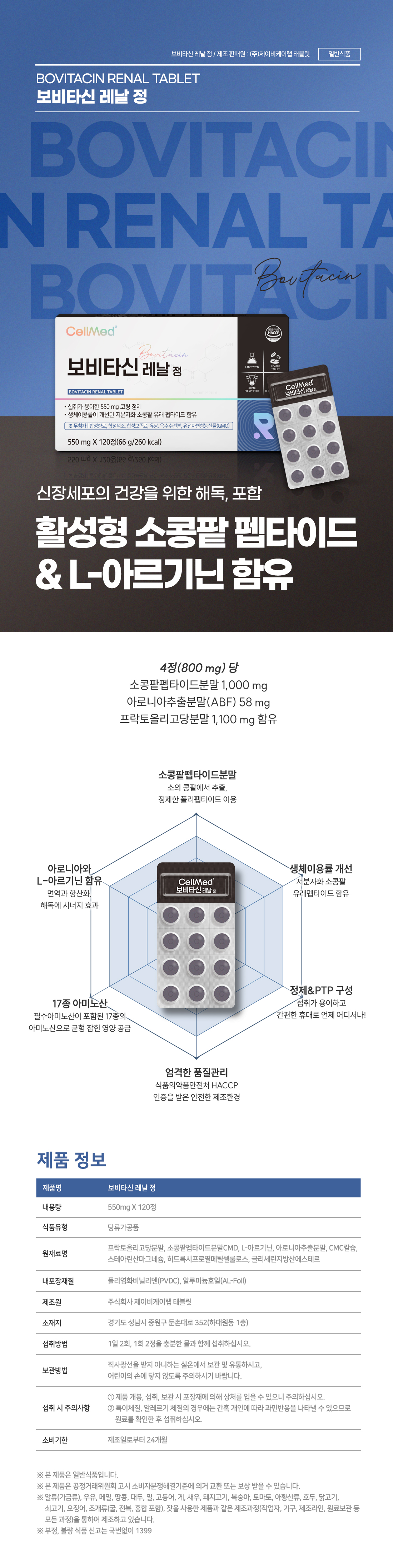 4정(800 mg)당 소콩팥펩타이드분말 1,000 mg, 아로니아추출분말(ABF) 58mg, 프락토올리고당분말 1,100 mg 함유