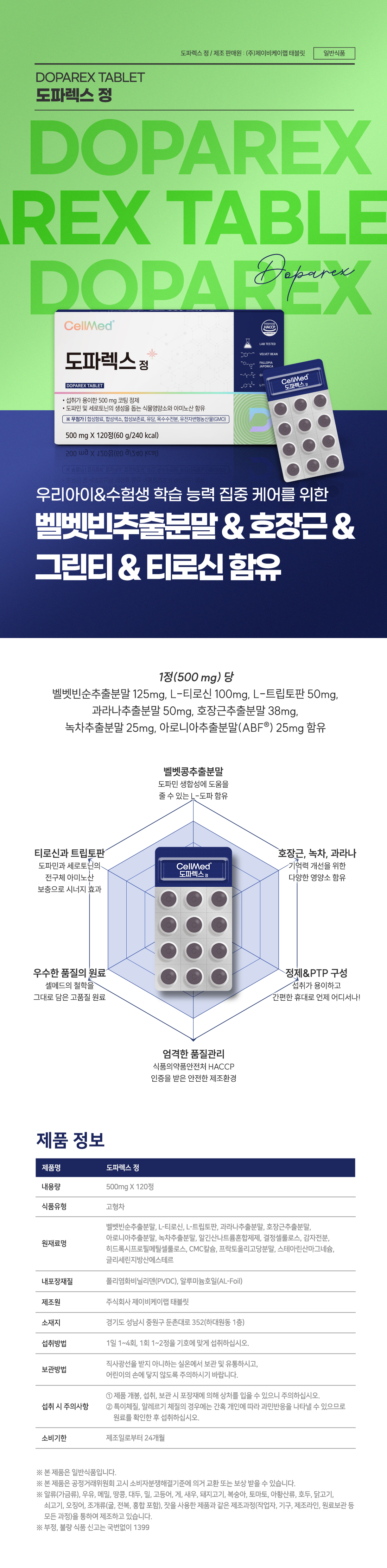 1정(500 mg) 당 벨벳빈순추출분말 125mg, L-티로신 100mg, L-트립토판 50mg, 과라나추출분말 50mg, 호장근추출분말 38mg, 녹차추출분말 25mg, 아로니아추출분말(ABF®) 25mg 함유