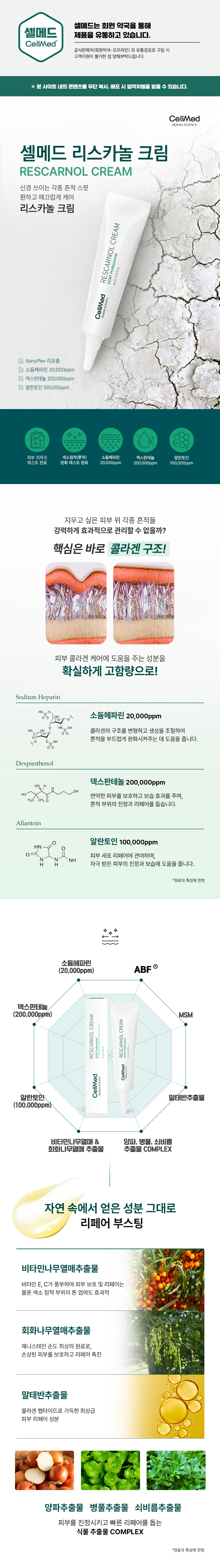 소듐헤파린(20,000ppm), 덱스판테놀(200,000ppm), 알란토인(100,000ppm), ABF®, MSM, 말태반추출물, 비타민나무열매&회화나무열매 추출물, 양파, 병풀, 쇠비름추출물 COMPLEX