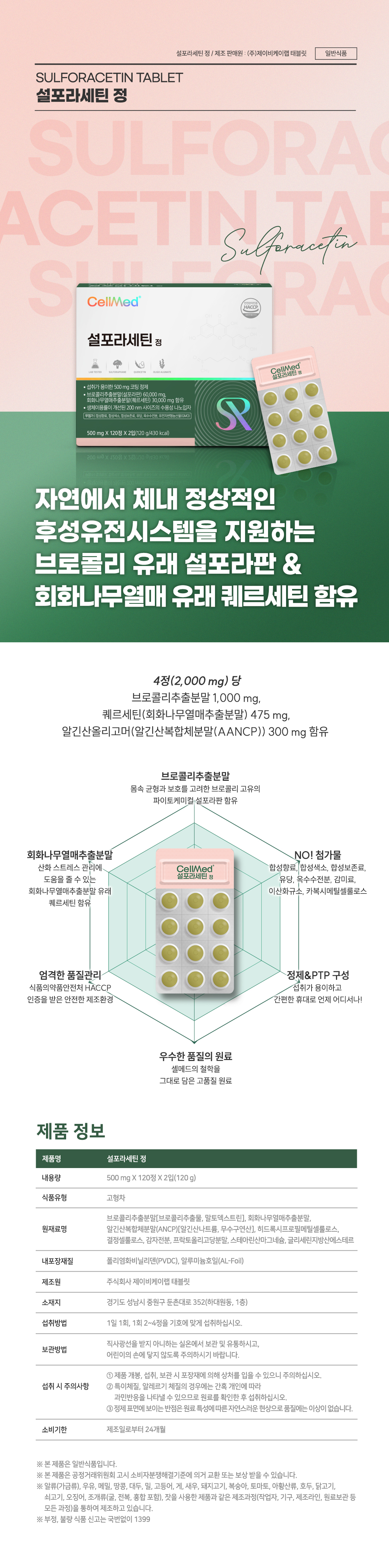 4정(2,000 mg) 당 브로콜리추출분말 1,000 mg, 퀘르세틴(회화나무열매추출분말) 475 mg, 알긴산올리고머(알긴산복합체분말(AANCP)) 300 mg 함유